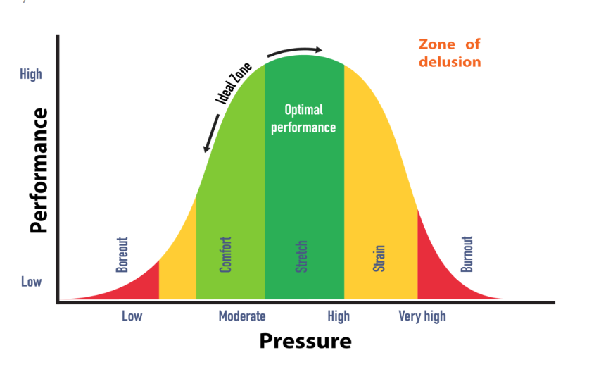 We’ve found the following graphic to be very helpful in illustrating when stress might be becoming too much. You can hear it in the language people use when, at one end of the scale, they talk about being “too comfortable” (boreout) and at the other end when they start to say things like they’re “a bit stretched” or that they’re “feeling the strain” – often these are clear signs that stress is a bit too high and we would benefit from some time off or, at least, time away from the pressures of the working day/week.